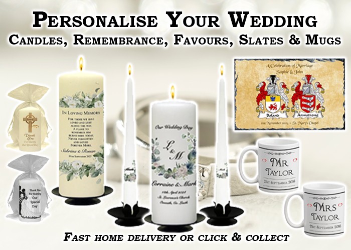 Shop NowBeautiful range of personalised candles, Thank you Favours for your guests, Photo Slates and customised photo Mugs. Personalises Wedding anniversary gifts for the ones you love with our beautiful designs with and without photos. Each candle comes personalised with your details & wrapped with a bow and presented in an organza bag. Each Thank you favour comes in an organza bag ready to give to your guest. Fast delivery or choose 'Click & Collect' on all gifts