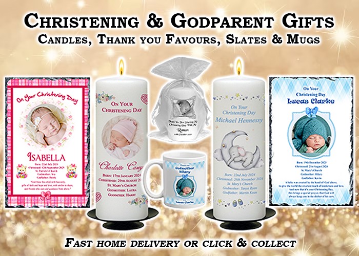 Wide range of personalised hand made Christening and Naming Day candles, Thank you Favours for your guests, Photo Slates and Godparent Gifts and Mugs. Personalise your baby's special day with our beautiful designs with and without photos. Each Christening candle comes personalised with your details & wrapped with a bow and presented in an organza bag. Each Thank you favour comes in an organza bag ready to give to your guest. Special package offers available. Fast delivery or choose 'Click & Collect' on all gifts